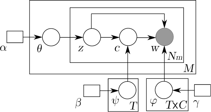 We further employ the Generalized Pólya urn (GPU) model [40] which was shown to be effective in leveraging semantically related words [10, 11, 42]. The GPU model here basically states that assigning topic and cluster to term will not only increase the probability of connecting and with , but also make it more likely to associate and with term where shares a 2-pattern with in . The amount of probability increase is determined by matrix defined as: