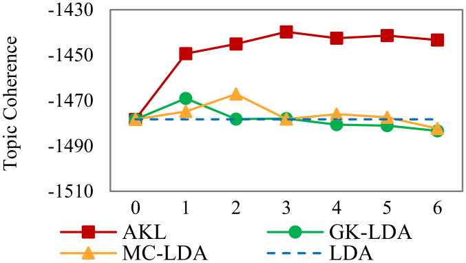 Figure 3 shows the average Topic Coherence of each model using knowledge learned at different learning iterations (Figure 1). For MC-LDA or GK-LDA, this is done by replacing AKL in lines 7 and 19 of Figure 1 with MC-LDA or GK-LDA. Each value is the average over all 36 domains. From Figure 3, we can observe the followings: