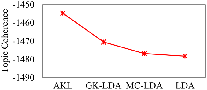We now evaluate AKL in test setting , i.e., the automatically extracted knowledge (Figure 1) is applied in new/unseen domains other than those in domains used in knowledge learning. The aim is to see how can help modeling in an unseen domain. In this set of experiments, each domain is tested by using the learned knowledge from the rest domains. Figure 6 shows the average Topic Coherence of each model. The values are also averaged over the tested domains. We can see that AKL achieves the highest Topic Coherence value while LDA has the lowest. The improvements of AKL over all baseline models are significant with .