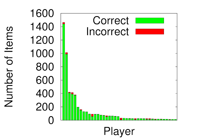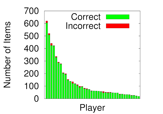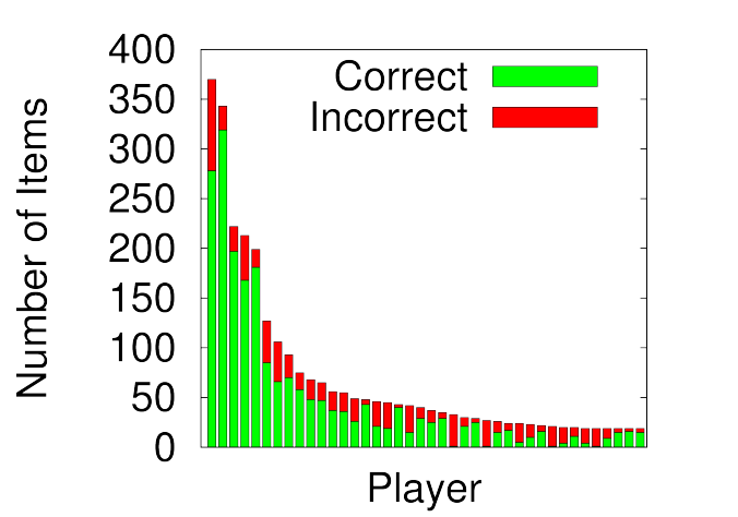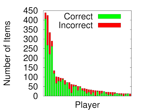 Second, the type of incentive did not change the percentage of items from that players correctly reject, shown for all players as -accuracy in Table 1 Column 3 and per-player in Figure 12. However, players were much more accurate at rejecting items from in TKT than in Infection. We attribute this difference to the nature of the items and the format of the games. The images used by TKT provide concrete examples of a concept, which can be easily compared with the game’s current concept; in addition, TKT allows players to inspect items as long as a player prefers. In contrast, concept-concept associations require more background knowledge to determine if a relation exists; furthermore, Infection gives players limited time to decide (due to board length) and also contains cognitive distractors (zombies). Nevertheless, player accuracy remains high for both games (Table 1, Col. 3) indicating the games represent a viable medium for making annotation decisions.