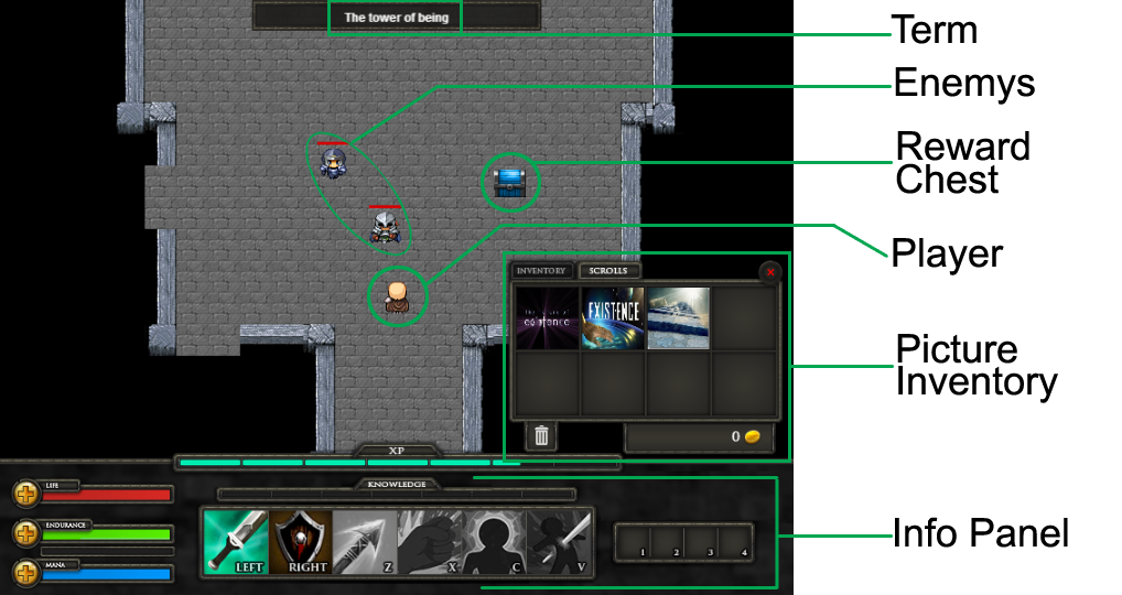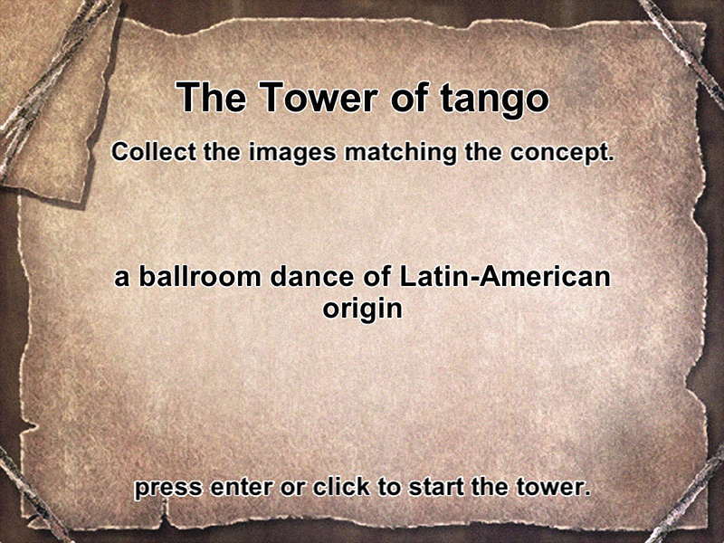 Design TKT is designed as a single-player role playing game (RPG) where the player explores a series of towers to unlock long-forgotten knowledge. At the start of each tower, a target concept is shown, e.g., the tower of “tango,” along with a description of the concept (Figure 7). The player must then recover the knowledge of the target concept by acquiring pictures of it. Pictures are obtained through defeating monsters and opening treasure chests, such as those shown in Figure 7. However, players must distinguish pictures of the tower’s concept from unrelated pictures. When an image is picked up, the player may keep or discard it, as shown in Figure 7. A player’s inventory is limited to eight pictures to encourage them to select the most relevant pictures only.