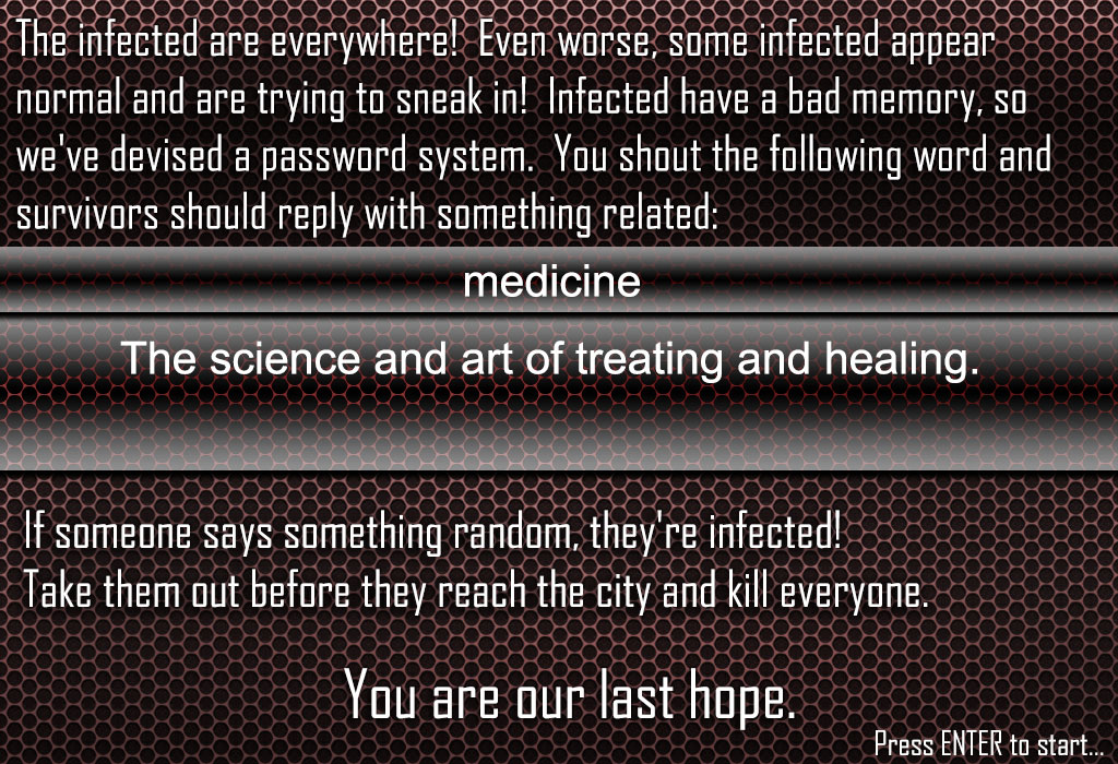 In the game, some humans are infected, but have not yet become zombies; these infected humans must be stopped before reaching the city. Because infected and uninfected humans look identical, the player uses a passphrase call-and-response mechanism to distinguish between the two. Each level features a randomly-chosen passphrase that the player’s character shouts. Uninfected humans are expected to respond with a word or phrase related to the passphrase; in contrast, infected humans have become confused due to the infection and will say something completely unrelated in an attempt to sneak past. When an infected human reaches the city, the city’s total infection level increases; should the infection level increase beyond a certain threshold, the player fails the stage and must replay it to advance the game. Furthermore, if any time after ten humans have been seen, the player has killed more than 80% of the uninfected humans, the player’s gun is taken by the survivors and she loses the stage.