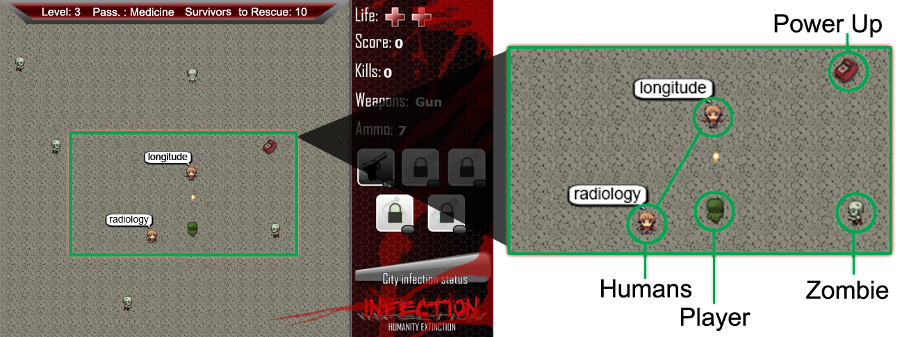 Design Infection is designed as a top-down shooter game in the style of Commando. Infection features the classic game premise that a virus has partially infected humanity, turning people into zombies. The player’s responsibility is to stop zombies from reaching the city and rescue humans that are fleeing to the city. Both zombies and humans appear at the top of the screen, advance to the bottom and, upon reaching it, enter the city.