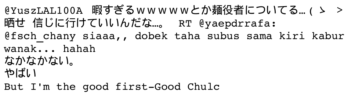 The trained SRN language model can be used to generate random text by sampling the next byte from its predictive distribution and extending the string with the result. Figure 1 shows example strings generated in this way: the network seems to prefer to output pseudo-tweets written consistently in a single script with words and pseudo-words mostly from a single language. The generated byte sequences are valid UTF-8 strings.