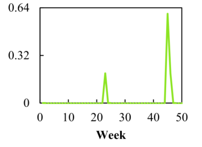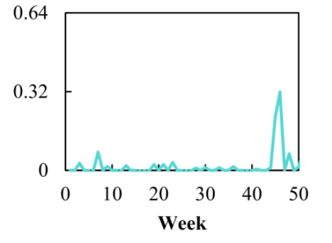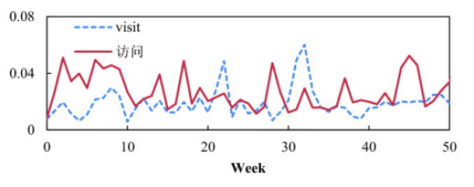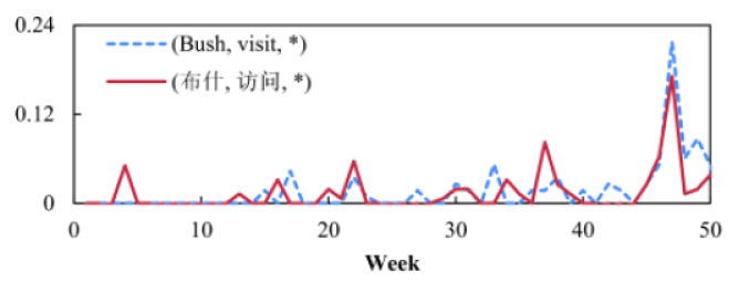We exploit the temporal distribution of textual element during -th week in statements; we count the occurrences of the element on a weekly basis, and normalize them to observe . For example, Figure 5 shows the relation temporal distribution visit against week . Unlike entities, we can easily observe the dissimilarity of the temporal distributions of semantically equivalent relations. We identify the three big challenges in exploiting the temporality in relation translations.